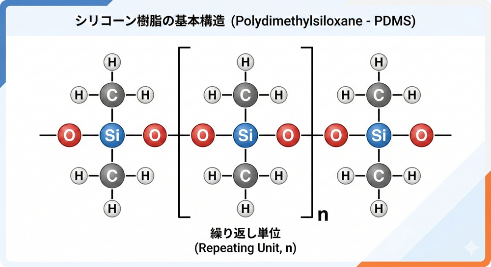 真ん中横方向に伸びる、赤色のO(酸素)と青色のSi(ケイ素)の連鎖が、シリコーン樹脂のメイン構造。