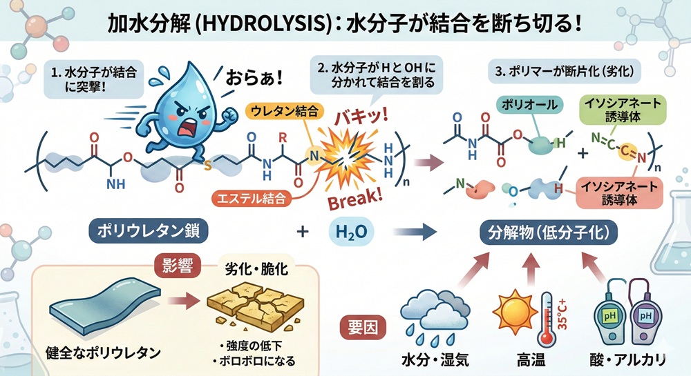 空気中の水分(H2O)が分子の鎖をぶった切る反応、それが加水分解。