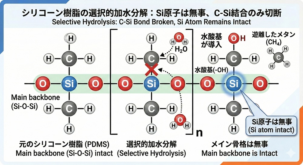 太陽光のエネルギー(紫外線)は、炭素の鎖をブチブチに切断しますが、シリコンの強力な結合を壊すにはエネルギーが足りません。