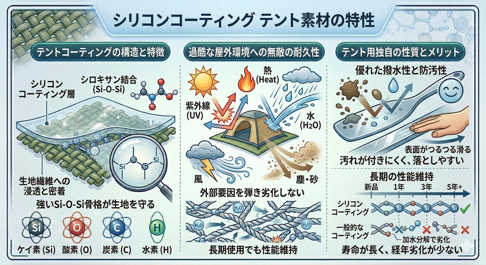 ケイ素(Si)はシリコン (Silicon)と同義で、(Si)を使った樹脂のシリコーン樹脂を、テントとかのコーティングに使用します。