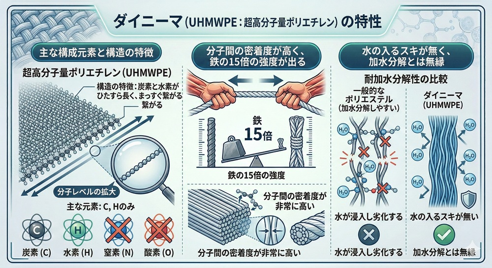 加水分解しない、鉄の15倍の強度。ダイニーマが最強たる所以よ。