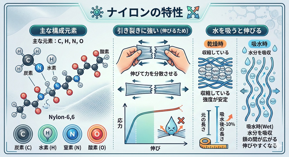 | ナイロン | 最も一般的 | 軽く、弾力性があり、摩擦に強い | 紫外線に弱く、吸水すると少し伸びる |