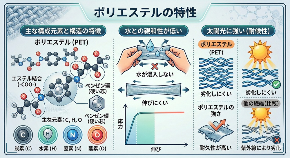- 構造の特徴:「エステル結合」。ベンゼン環(六角形の構造)という硬い芯を持つ