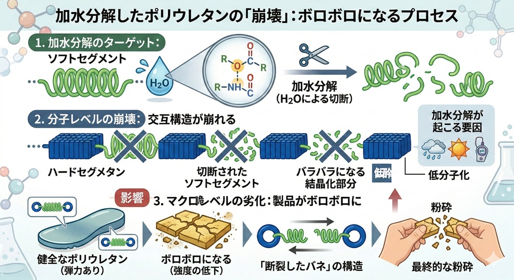 元素レベルで見ると、水のOが入り込んで鎖を切断し、ベタベタの別物質に変えてしまうイメージかな。