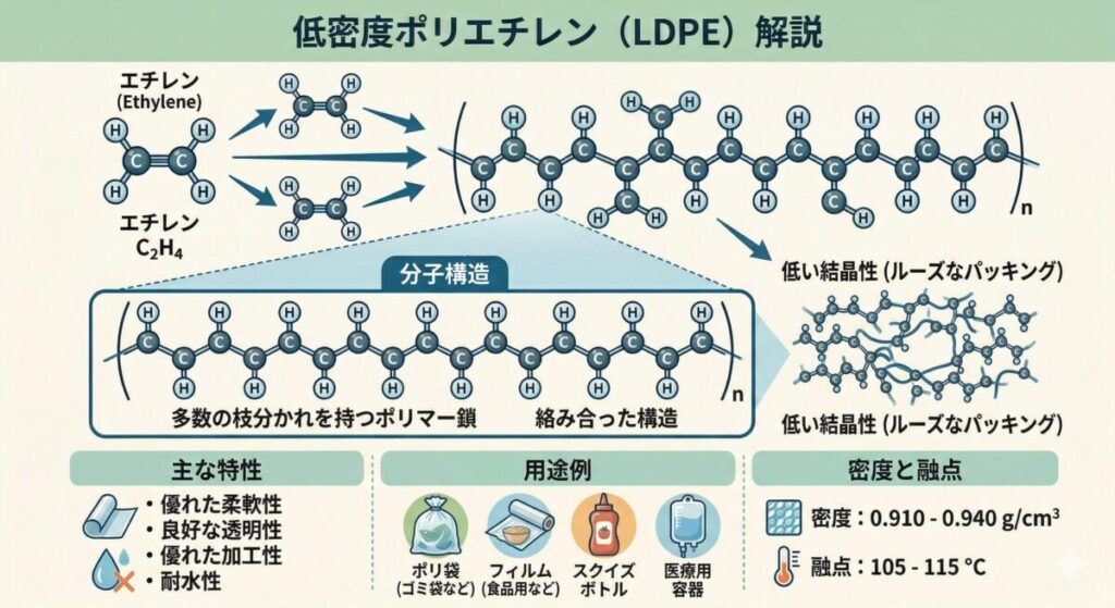- 構造: エチレン(CH_2=CH_2)という分子が、数千、数万と数珠つなぎになったものです。