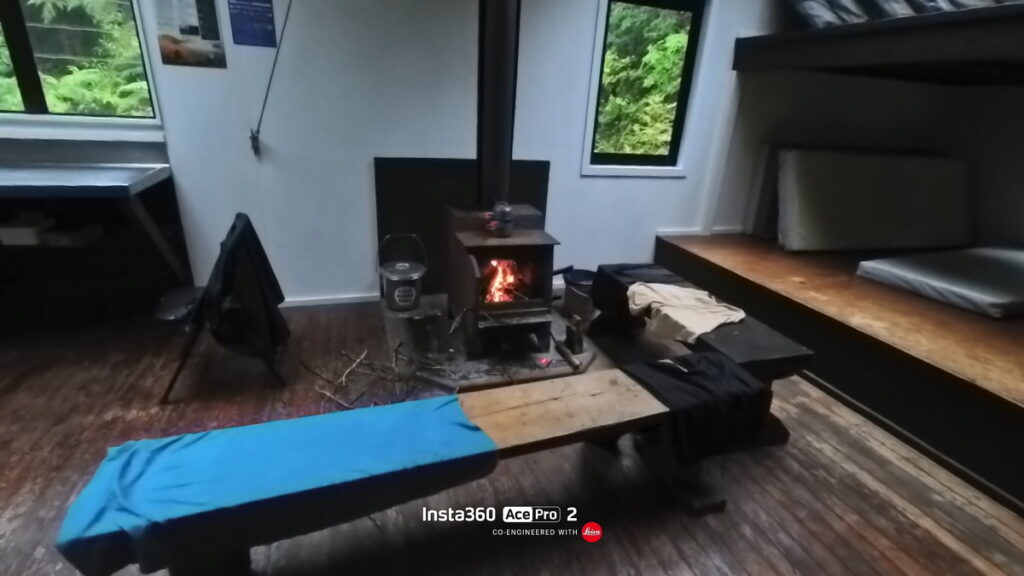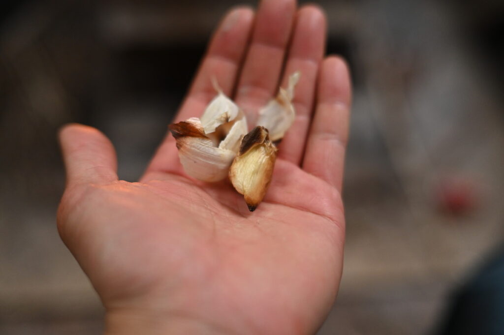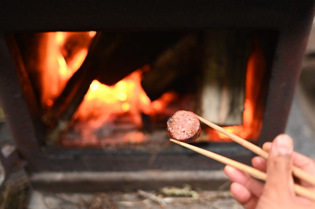 薪ストーブではなく焚き火のようにし、火で湯を沸かしたり、ニンニクを放り込んだり。
