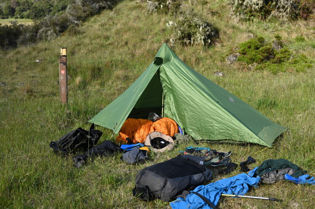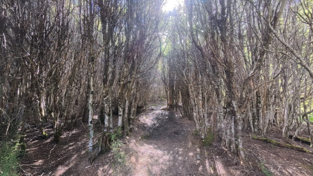 ここからの樹林帯が長く、開けた場所に出たところでテントを張ろうとしたけども、鳥の糞だらけだったので辞めた。