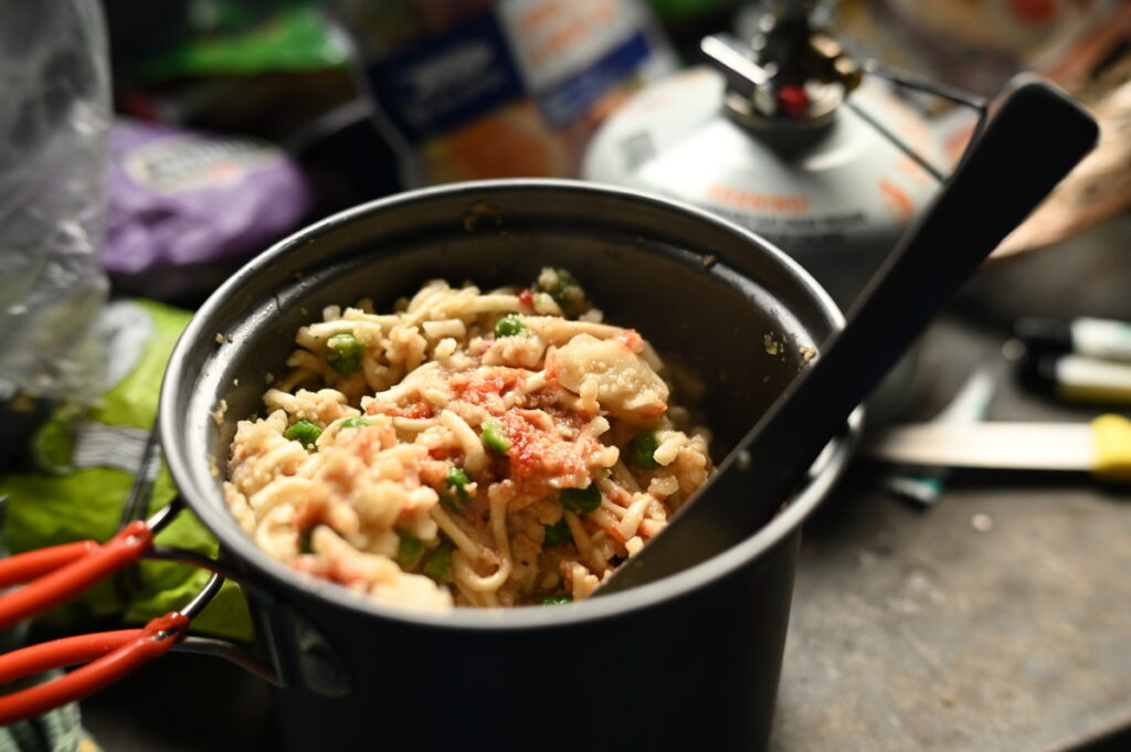 日清ラーメンに、チーズ、クスクス、ツナ、グリンピース、トマトペースト、ブラックペッパーを入れた、爆弾トレイル飯。