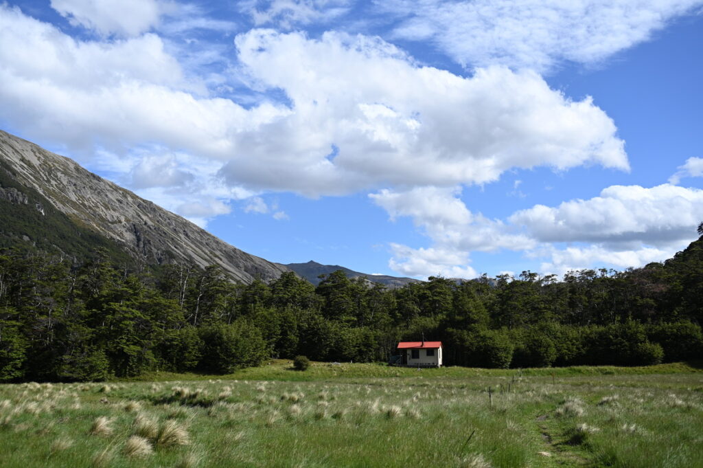 山と森と草原に囲まれた、可愛い赤い屋根のHut。