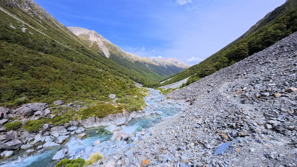 Blue lakeらHutまでは薄登り、段々と急流になっていく辺りから、景色が良くなる。