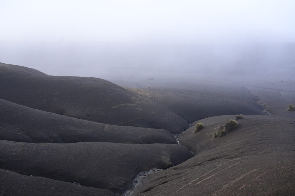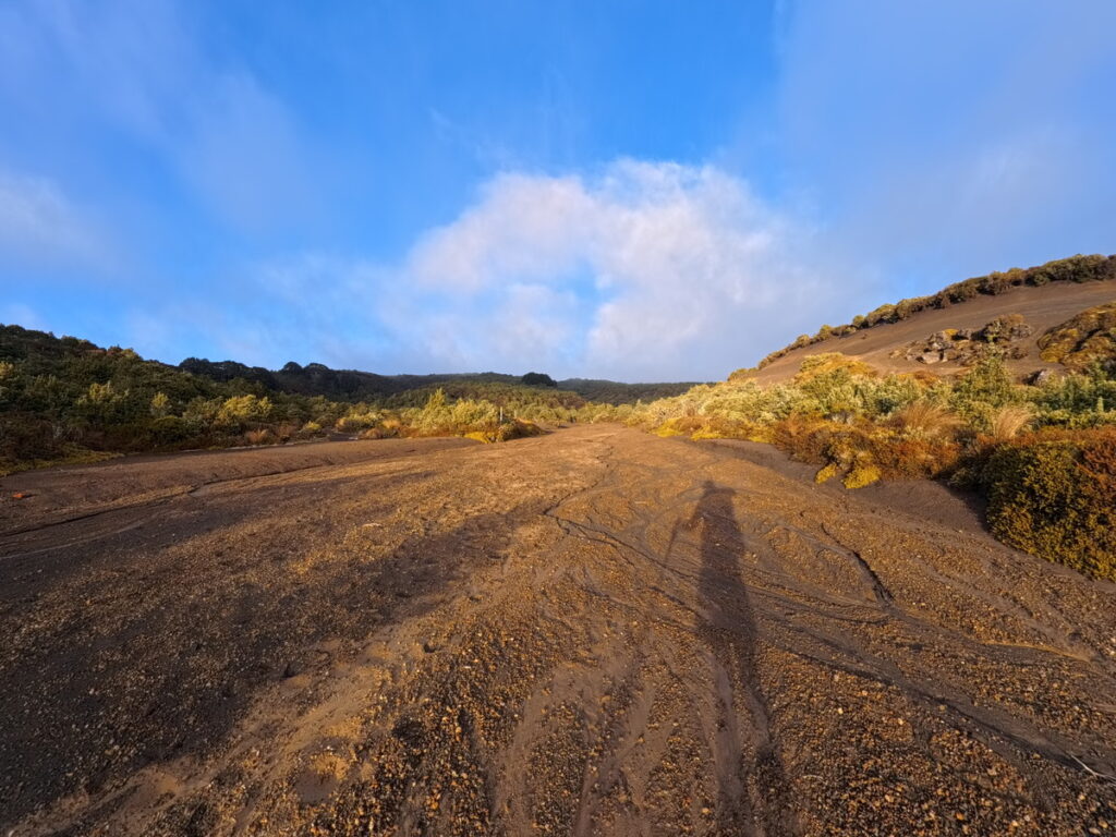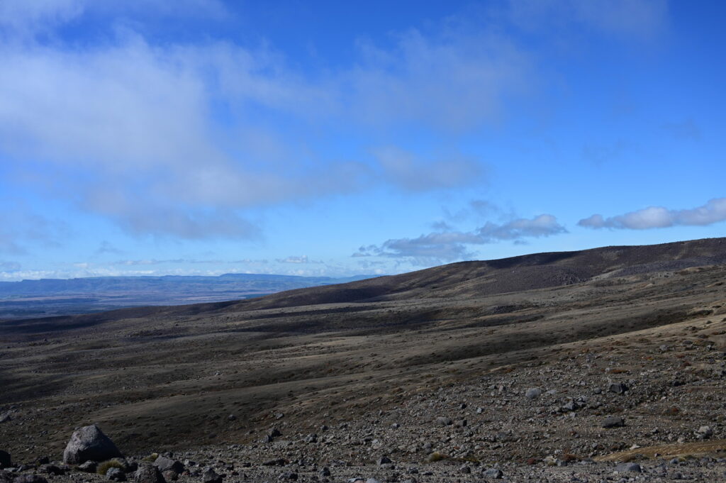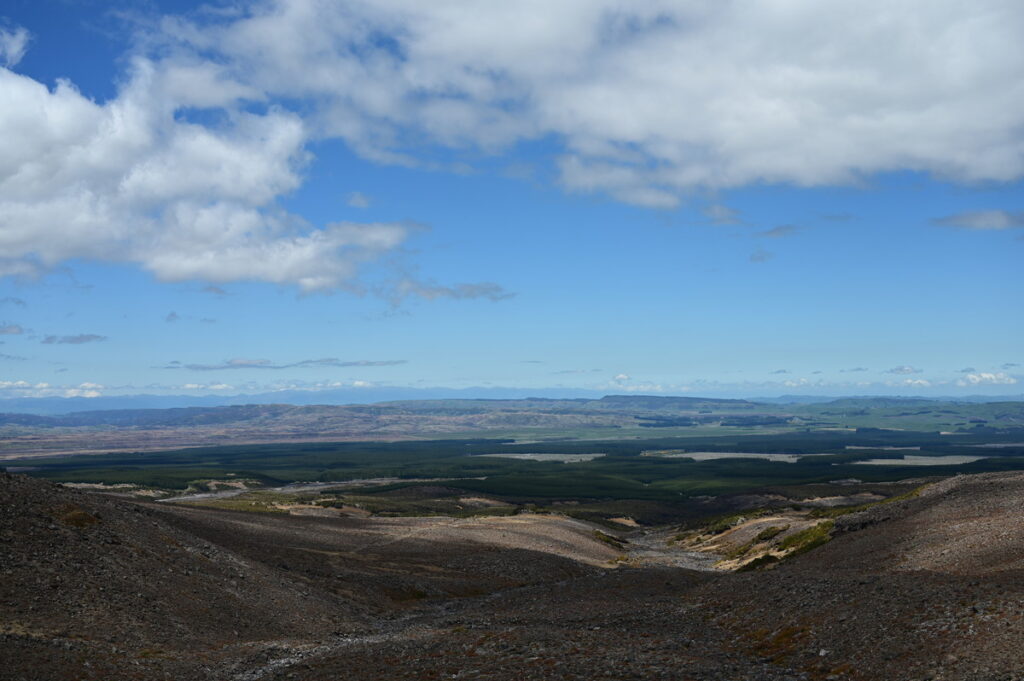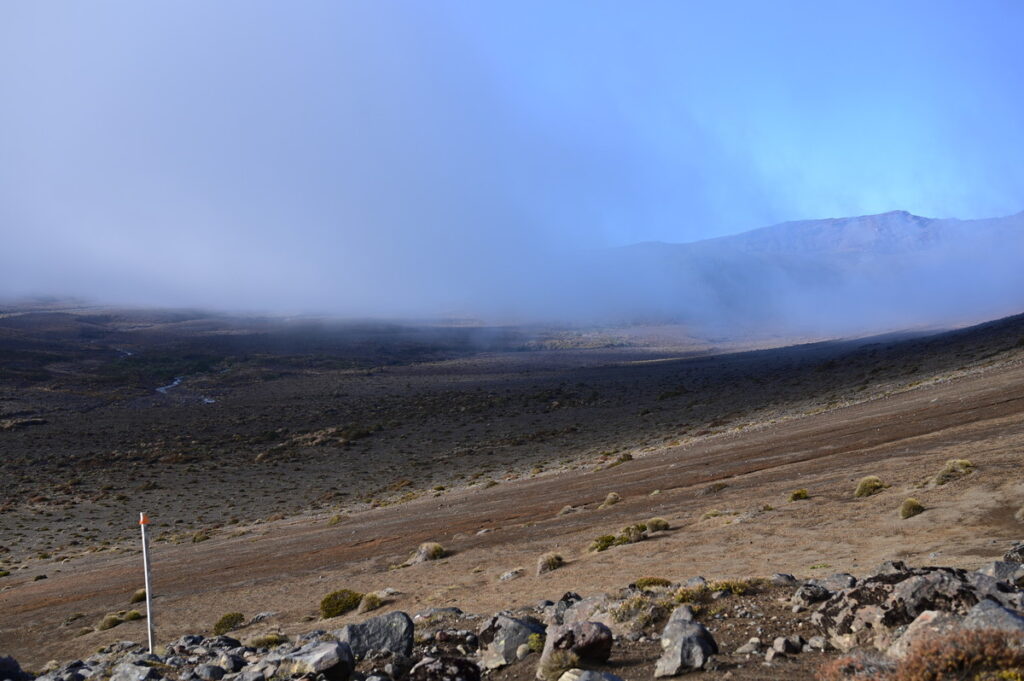 ガスでルアペフ山は見えなくなり、遠くの景色は砂漠的な荒れ地から、緑に変わり始めた。