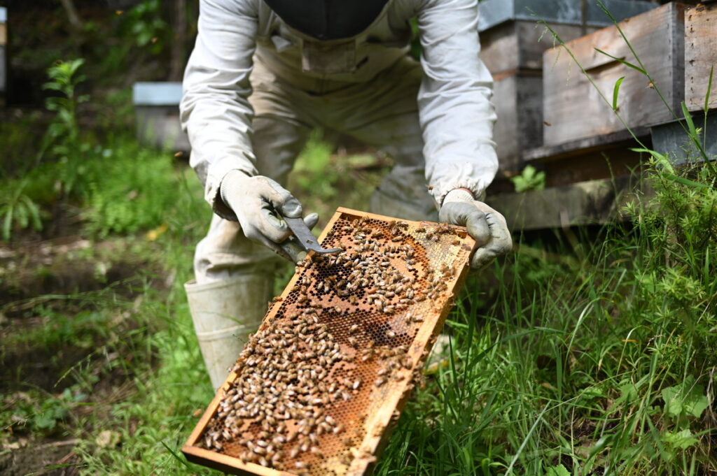 巣箱は1000管理していて、1つあたり30-40kg取れること、去年は44000kg取れた事などを聞いた。